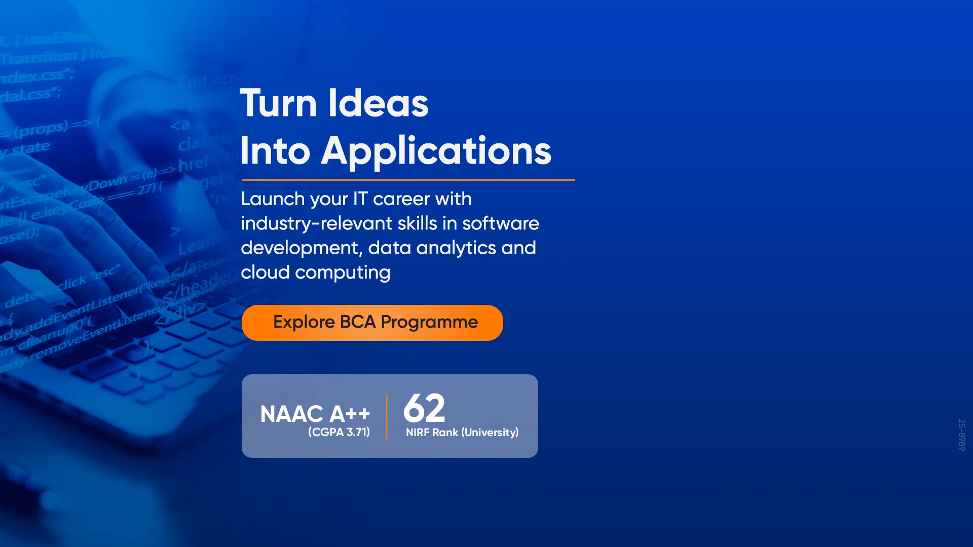 At JAIN (Deemed-to-be University), the BCA programme combines rigorous computer science fundamentals with hands-on coding experience to prepare you for the dynamic IT industry.