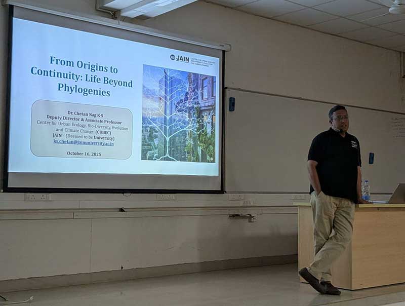 Dr. Chetan Nag K.S. delivered a talk titled "From Origins to Continuity: Life Beyond Phylogenies" at the Evolution Across Scales Symposium, organized by the Centre for Ecological Sciences (CES), Indian Institute of Science (IISc), Bengaluru, on October 16, 2025.